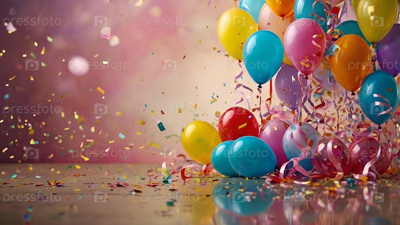 Праздничный фон на день рождения или фон для распродажи с разноцветными шарами и летящим серпантином