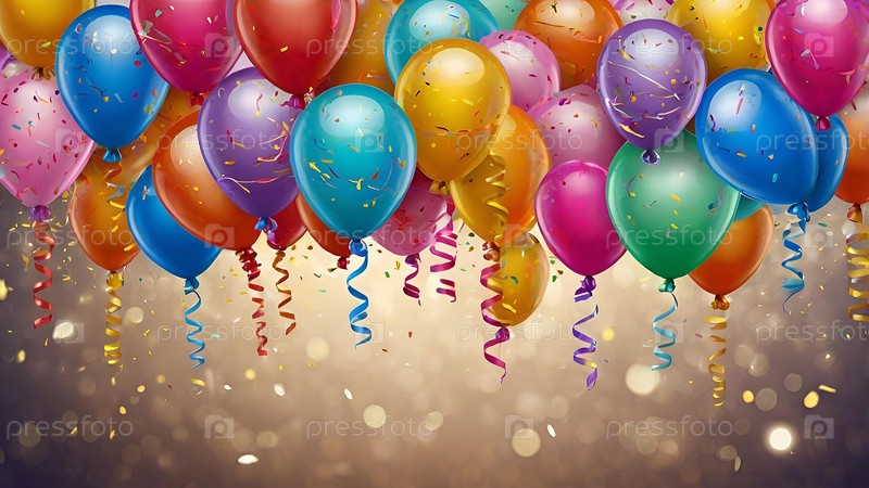 Праздничный фон на день рождения или фон для распродажи с разноцветными шарами и летящим серпантином