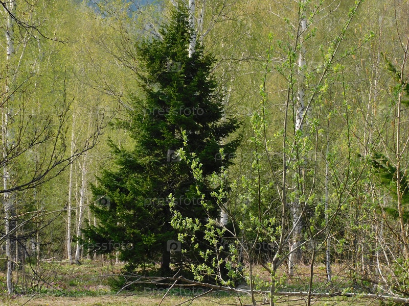 Густой лесной пейзаж с вечнозелеными деревьями и пышной листвой весной