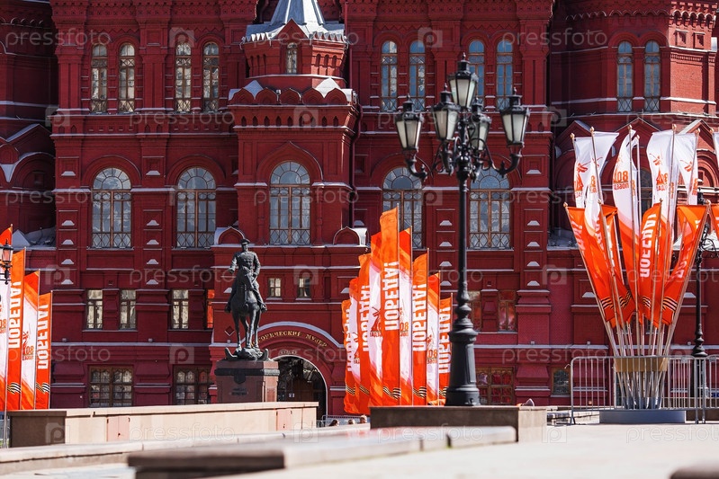 Россия, Москва, 28 апреля 2025 года. Подготовка к празднованию 80-летия Победы в Великой Отечественной войне. Праздничные флаги на фоне маршала Жукова