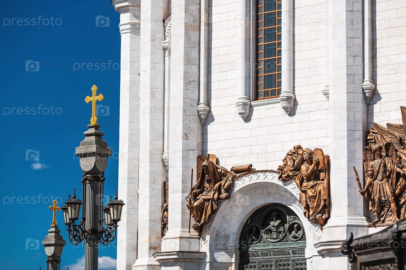 Русский православный собор. Храм Христа Спасителя в Москве. Детали, декоративные элементы на фасаде храма крупным планом. Российская Федерация, Москва