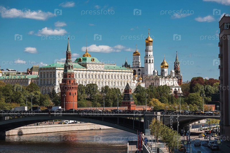 МОСКВА, РОССИЯ - 25 АПРЕЛЯ 2025 ГОДА: вид на Московский Кремль в солнечный весенний день. Ярко-голубое небо. Визитная карточка Москвы