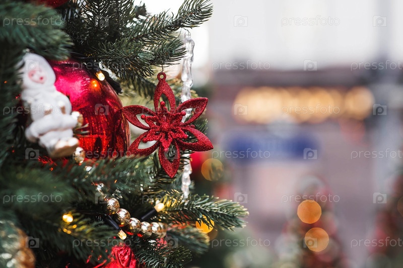 Красивые праздничные игрушки на елке. Крупный план. Красивый рождественский фон. Концепция подготовки и украшения к новому году. Новогодняя открытка 2026