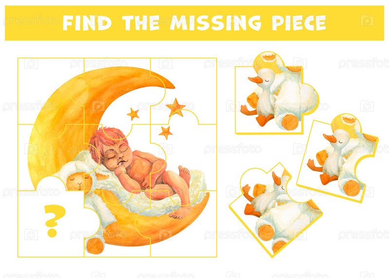 Найдите недостающий фрагмент картинки с милым младенцем, спящим на луне. Игра-головоломка Сладкие сны. Выберите правильный элемент акварельной композиции с изображением младенца и плюшевых ягненка и утенка