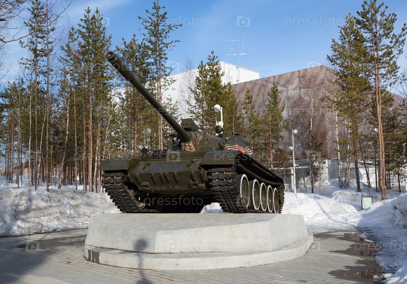 Танк на постаменте в парке Опаленной юности в городе Ноябрьске весной