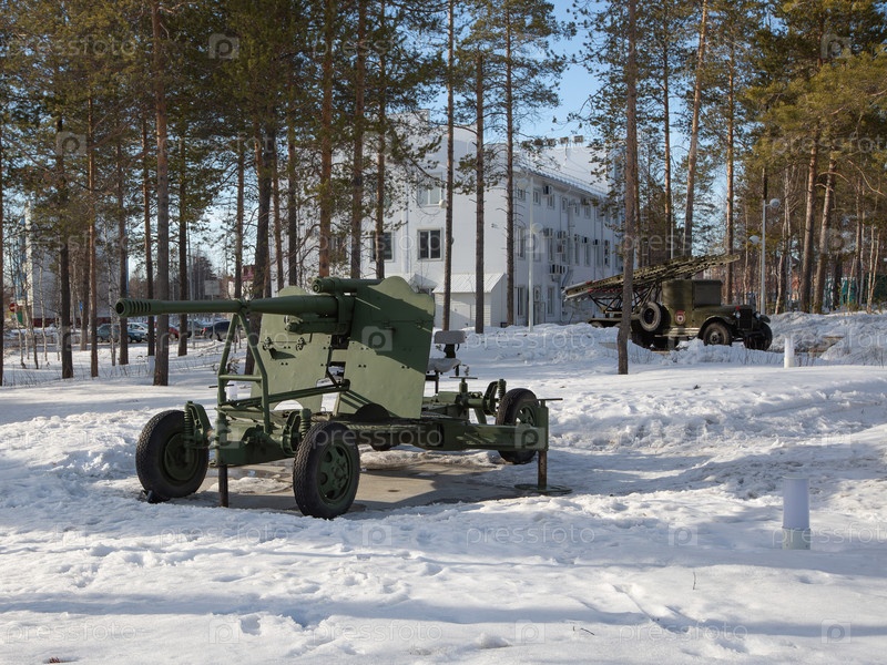 Гаубица и Катюша в парке Выжженной Молодости в городе Ноябрьске весной