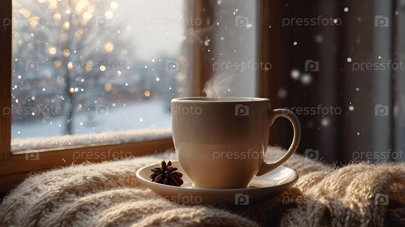 Кружка с горячим какао или кофе на зимнем окне. Напиток дымится. Уютное фото в нежных, теплых бежевых тонах. Гармония и уютная концепция Рождества и зимы