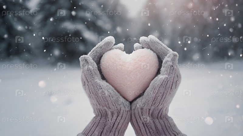 Женские руки в теплых варежках держат розовое сердце. Падает снег. День святого Валентина и Всемирный день здоровья, любви и семейного страхования