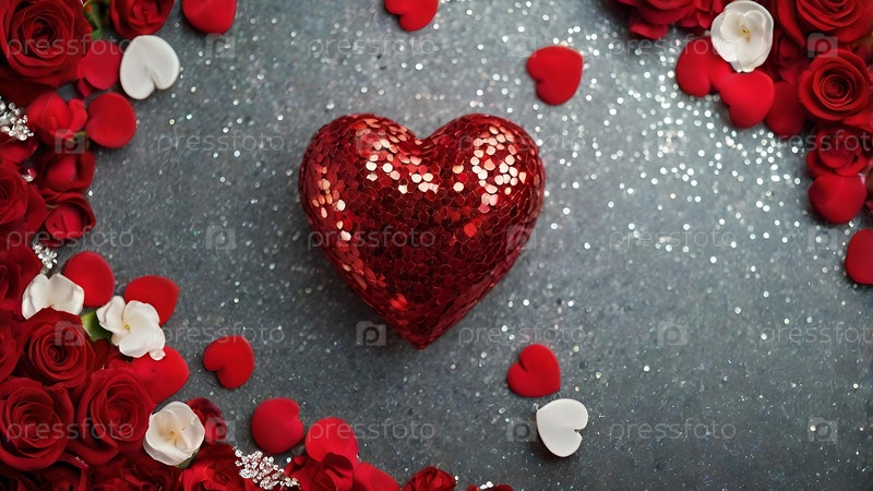 Баннер ко Дню святого Валентина. Красное сердце и розы с праздничными огнями в виде бортика на заднем плане. Макет пригласительного билета на вечеринку ко Дню святого Валентина, место для копирования