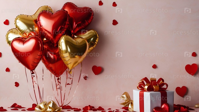 Баннер с подарочной коробкой и сердечками из красной и золотой фольги на розовом фоне. С Днем святого Валентина. 14 февраля