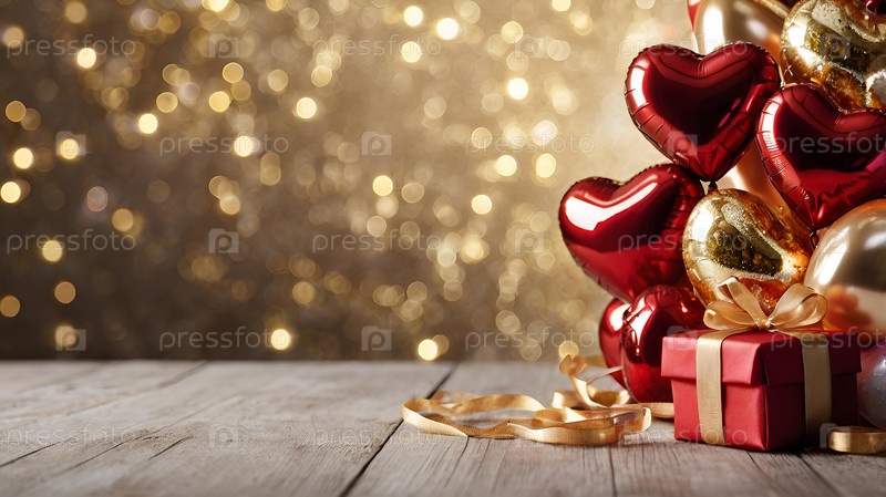 Баннер с подарочной коробкой и красными и золотыми сердечками из фольги на золотом фоне. С Днем святого Валентина. 14 февраля