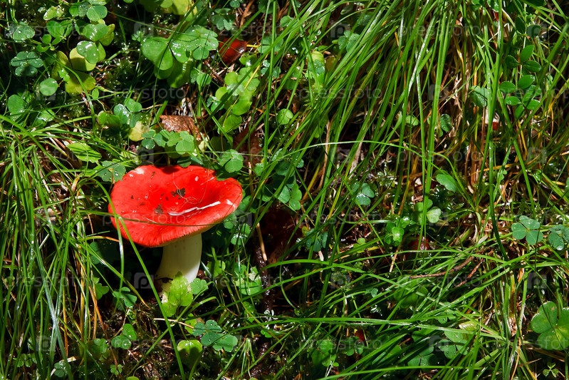 Красные лесные грибы на зеленом лугу