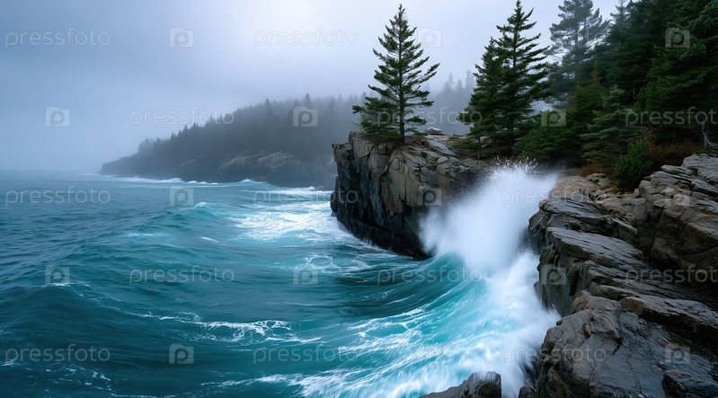 Океанские волны разбиваются о скалы возле туманного берега