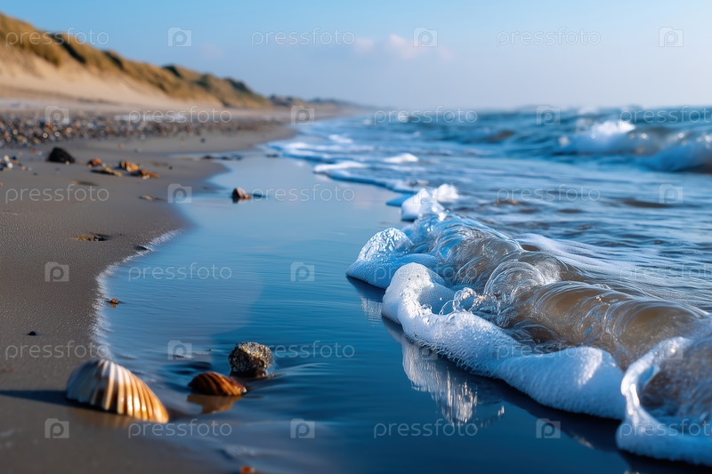 Красивый морской пейзаж с волнами и ракушками на пляже, прибой крупным планом