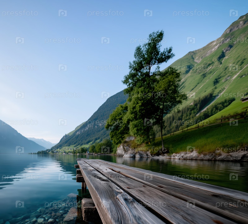 Деревянный пирс на берегу озера в горной долине