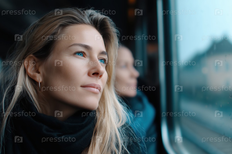 Крупным планом портрет красивой молодой женщины с длинными светлыми волосами и голубыми глазами в черном шарфе на фоне окна поезда