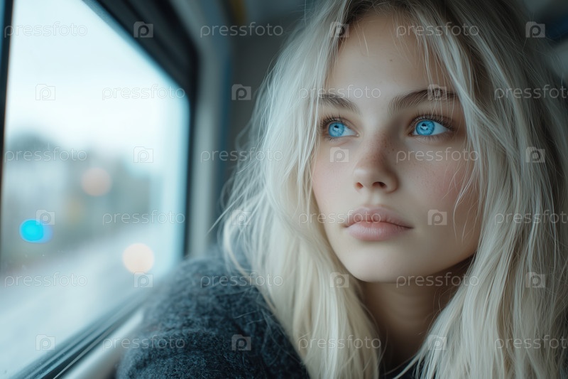 Портрет красивой девушки с голубыми глазами, смотрящей в окно поезда