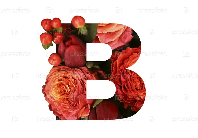 Цветочный шрифт буква B из настоящих красно-оранжевых роз для яркого дизайна. Стильный шрифт из цветов для концептуальных идей