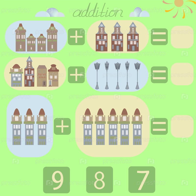 Посчитайте дома и фонари на картинке и впишите правильное число