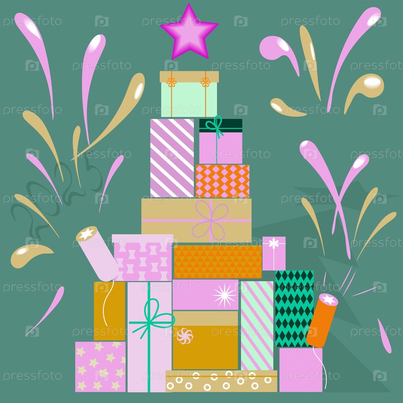 Открытка с новогодней елкой, собранной из подарочных коробок