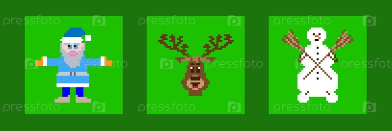 Рождественские иконки из пикселей, изображающие Санту, оленя и снеговика