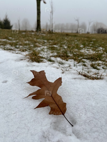 Прошлогодний красный дубовый лист в заснеженном парке в Жлобине, Республика Беларусь
