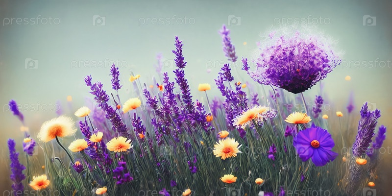 Причудливый и очаровательный фон с использованием смеси полевых цветов, таких как одуванчики, лаванда и маки. Панорама