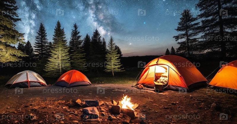 Уют кемпинга. Создайте уютную обстановку кемпинга с палаткой, установленной под звездным ночным небом, освещенной теплым костром. Панорама
