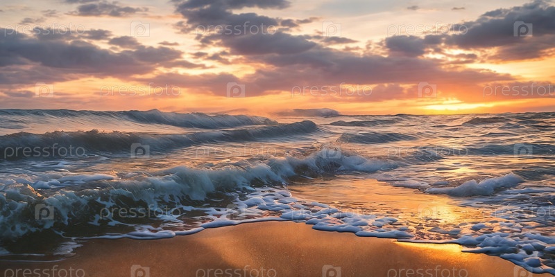 Иллюстрация морских волн на закате. Мерцающие волны отражают теплые оттенки заходящего солнца, создавая захватывающую дух картину. Генеративный ИИ