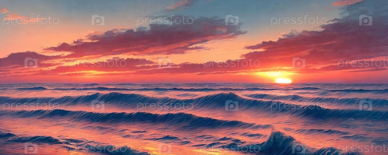 Закат над морем, волны на переднем плане, панорама