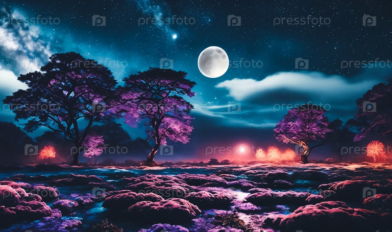 Захватывающая сцена на фантастической планете Рай, ночное небо, наполненное лунным светом и туманностями