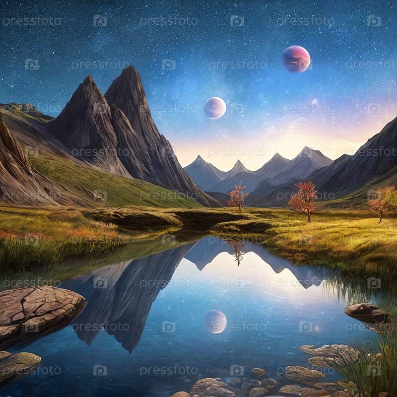 Фэнтезийная планета с озером на переднем плане, горами и ночным небом со звездами и планетами на заднем плане. Генеративный искусственный интеллект