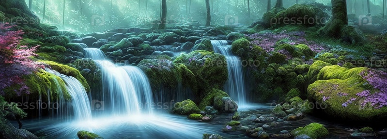 Фэнтезийный пейзаж с водопадами, панорама. Генеративный ИИ