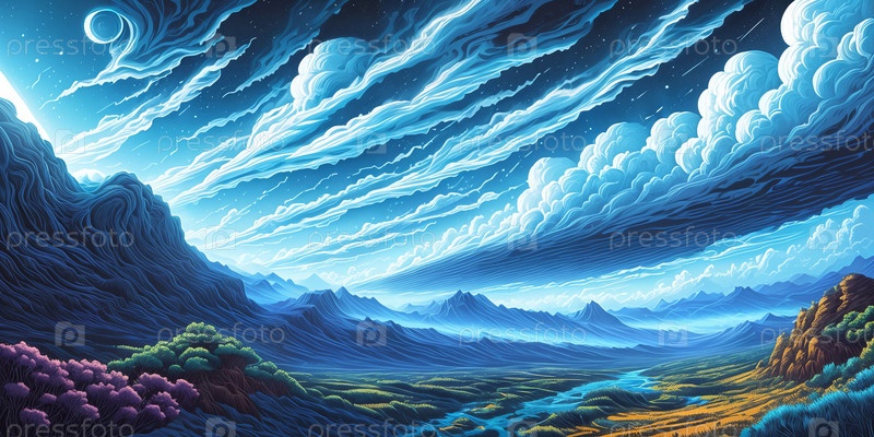 Иллюстрация облаков Юпитера, инопланетного ландшафта и растительности. Генеративный искусственный интеллект