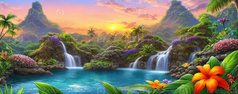 Фэнтезийный пейзаж с водопадами, цветами и тропическими растениями на переднем плане, панорама. Генеративный ИИ