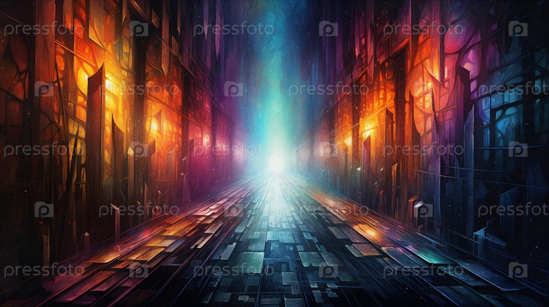Иллюстрация, изображающая яркий и таинственный темный туннель, в конце которого появляется пленительный свет. Загадочное путешествие. Генеративный ИИ