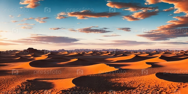 Огромное пустынное пространство с холмистыми дюнами под облачным, солнечным небом. Генеративный ИИ