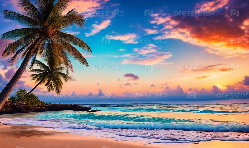 Закат окрашивает небо в оттенки оранжево-розового над тихим пляжем с пальмой, которая покачивается. Волны целуют берег. Генеративный ИИ