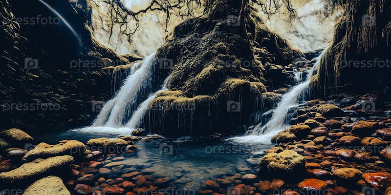 Зачарованный водопад. Водопад ниспадает по покрытым мхом скалам, открывая за своей завесой секретный грот. Кристально чистая вода искрится оттенками магии, а по берегам цветут красочные цветы