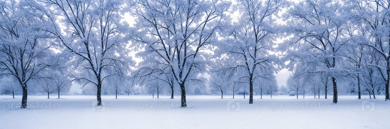 Безмятежный зимний пейзаж, живописная панорама. Заснеженные пейзажи, покрытые инеем деревья и зимние сцены. Генеративный