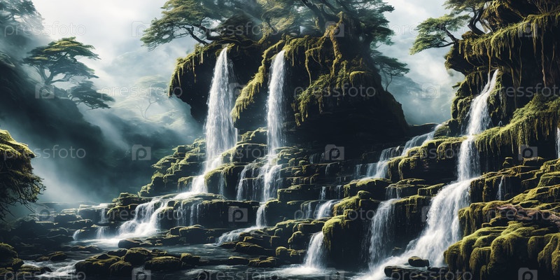 Сцена. Величественный водопад, ниспадающий со скалистого утеса
