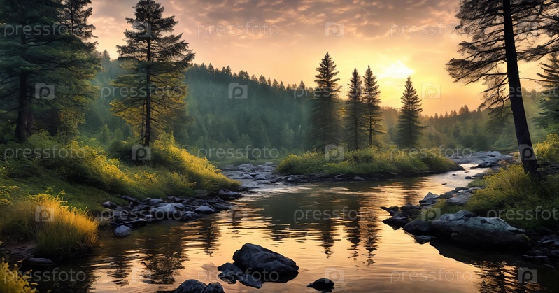 Яркий закат раскрашивает небо над спокойной лесной рекой, отражаясь золотистыми оттенками на скалах и пышном ландшафте. Генеративный ИИ