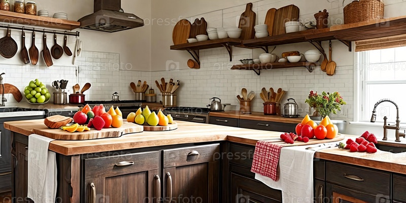 Kitchen Creations. Красиво оформленное изображение деревенской кухонной стойки со свежими фруктами, книгой рецептов и старинными кухонными принадлежностями