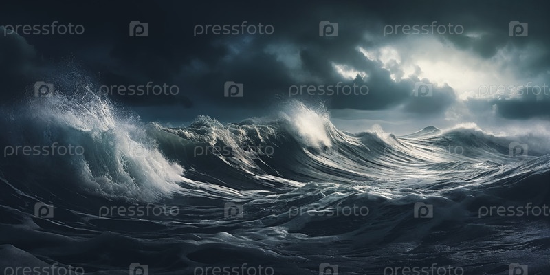 Бурное море под темными облаками с молниями, разбивающими волны. Бурные воды отражают чувство силы и опасности. Генеративный ИИ