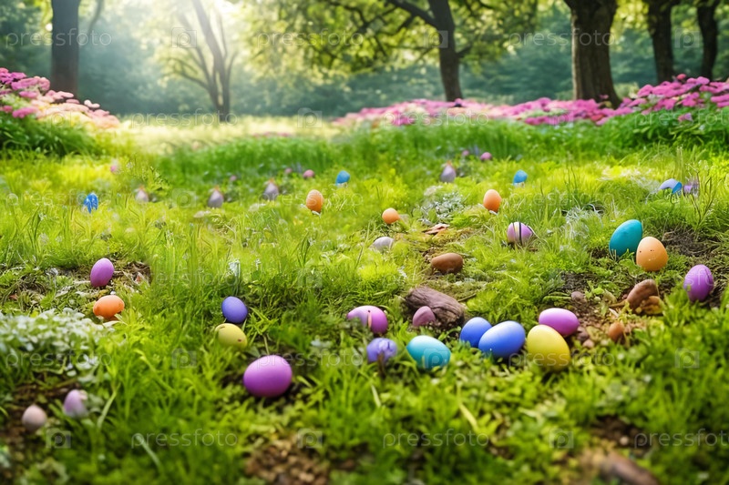 Охота за пасхальными яйцами. Причудливая сцена спрятанных пасхальных яиц, расположенных среди сочной зеленой травы, цветущих цветов и разбросанной листвы, создающая у зрителя ощущение волнения и открытия