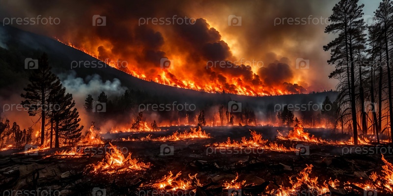 Интенсивность бушующего лесного пожара, охватывающего лес пламенем, захватывающая зрелище пылающих углей и клубящегося дыма на фоне темного неба. Панорама