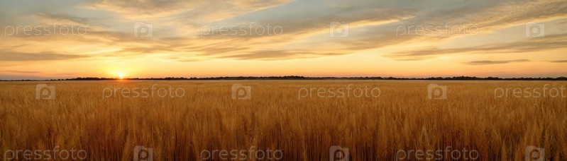 Спокойствие огромного пшеничного поля на закате, где теплые тона неба отражают золотистые оттенки спелых колосьев