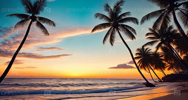 Закат окрашивает небо в оттенки оранжево-розового над тихим пляжем с покачивающейся пальмой. Волны целуют берег. Генеративный ИИ