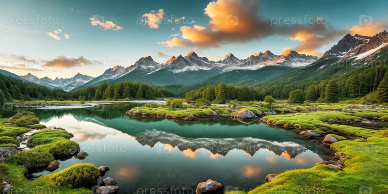 Захватывающая горная долина с тихим озером, окруженная густым лесом. Генеративный ИИ