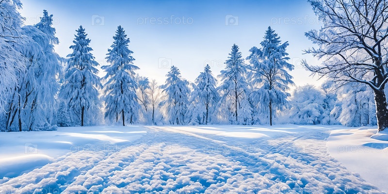 Спокойный зимний пейзаж, снег покрывает землю, деревья украшены инеем, живописная панорама. Генеративный ИИ